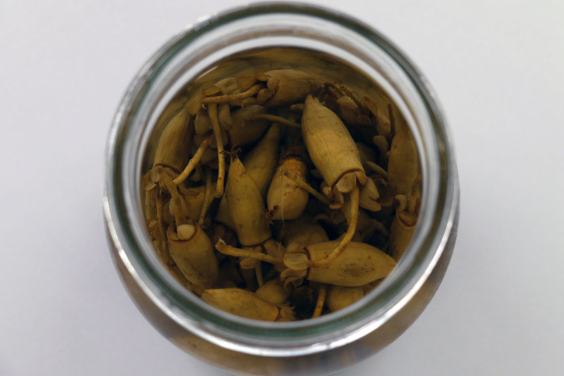 10月下旬~11月。淡いピンクの食用菊。山形の「もってのほか」が知られるが、食用菊の中でもこの「おもいのほか」ほどの食味をもつものはない。どう加工するか要検討中。