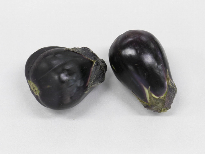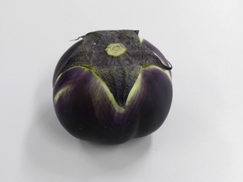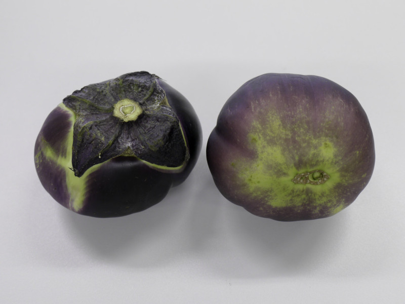 「中島巾着」は、扁平楕円形で縦に筋が入るのが特徴です。巾着なすの独特の食べ方として「蒸かしなす」が知られていますが、もともとは漬けものの材料でした。肉質が非常に緻密で、煮崩れせず、漬けものにするとヘタらない、容量が減らない、という点がすぐれている、とされます。