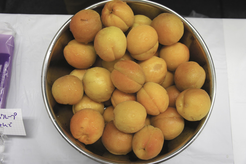 あんずは縦に包丁を入れて2つに割り、種をとる。