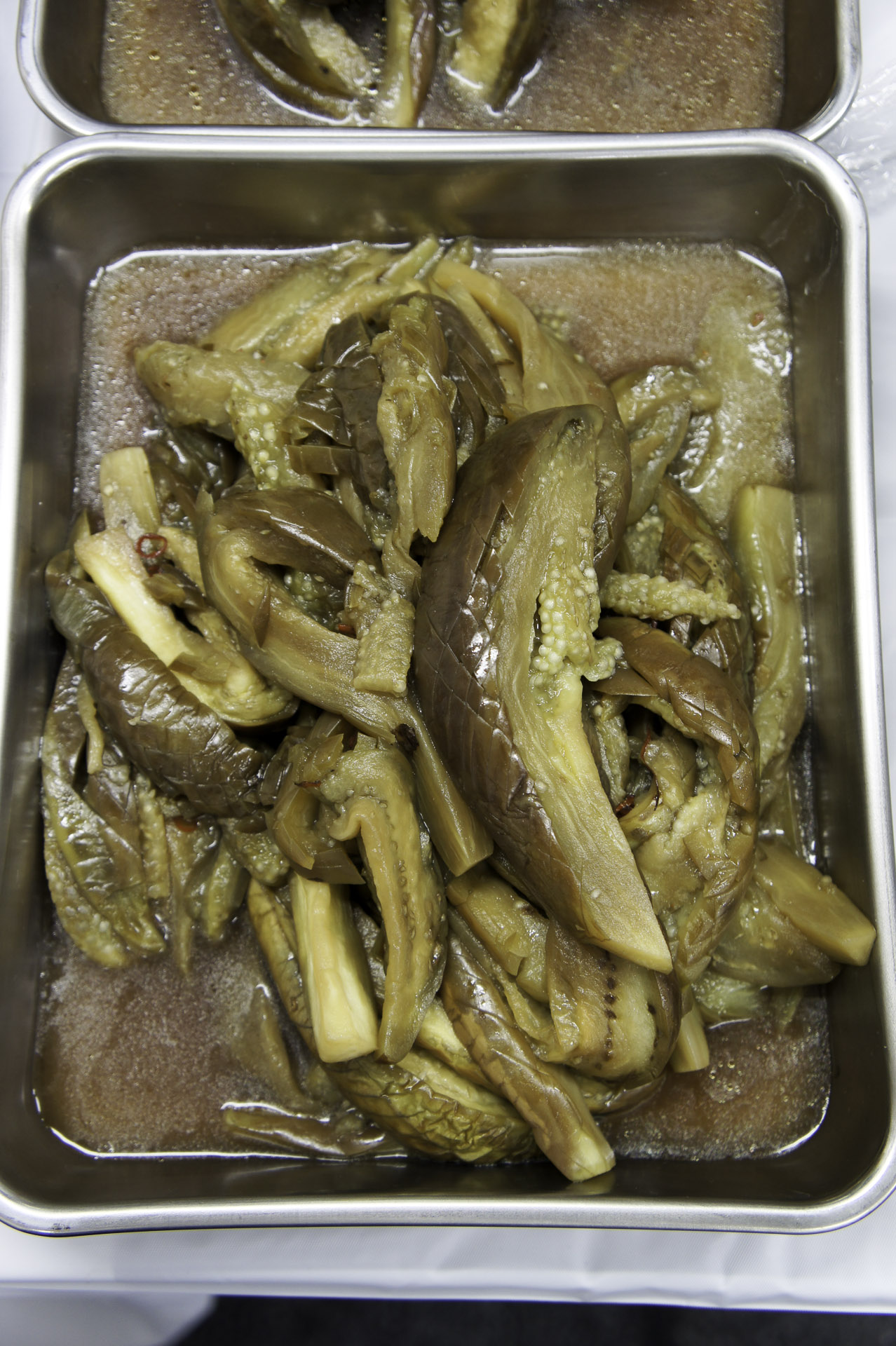 なすはへたをとり、縦半分に切って斜めに切り目を入れ、さらに縦半分に切る。赤とうがらしは小口切りにする。