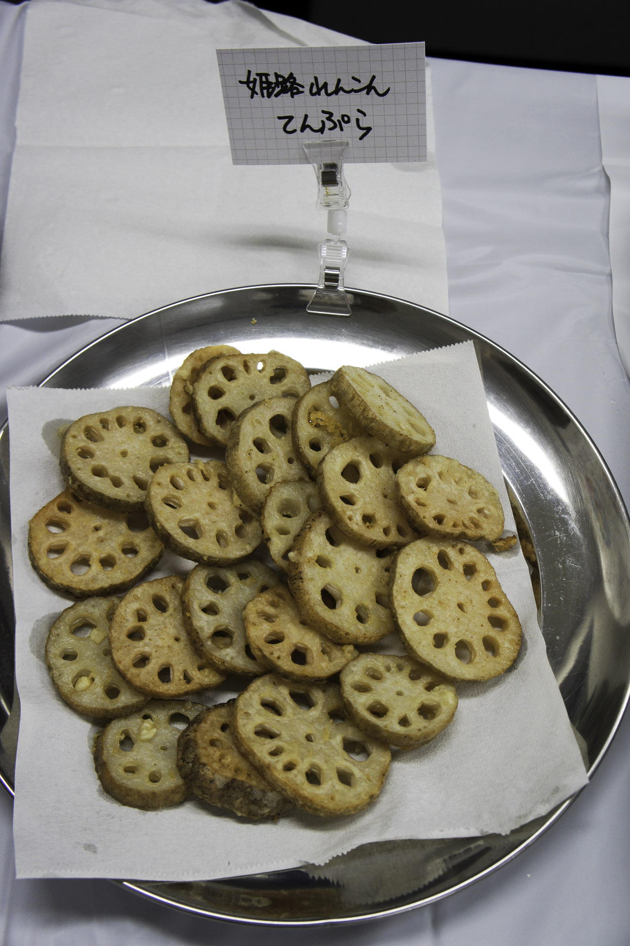 卵黄、水、小麦粉をなめらかになるまで混ぜて衣を作る。れんこんに衣をつけ、170℃の揚げ油で揚げる。塩や天つゆを添える。