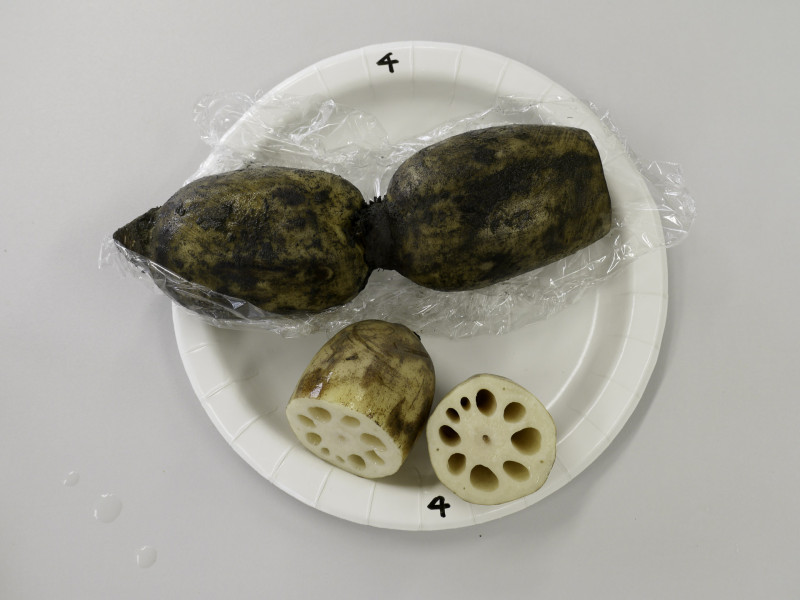 れんこんの皮をむき、1cm厚さのいちょう切りにする。水にさらして、水気をきる。