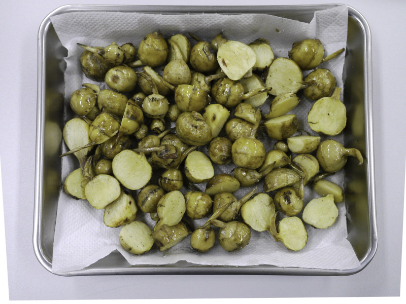 慈姑はよく洗い、大きいものは半分に切る。水気をふく。