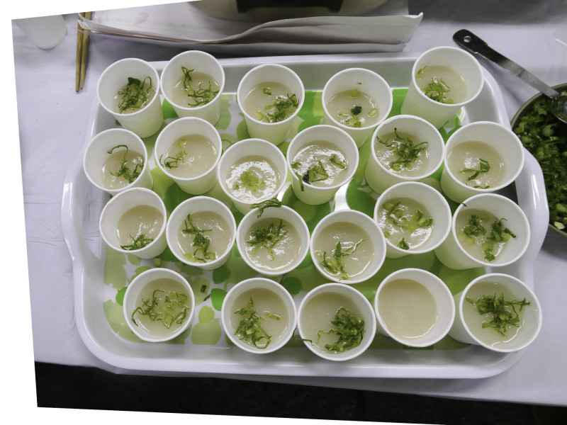 かぶがやわらかくなったら塩で味を調え、こす。かぶのポタージュを盛り、葉茎を散らす。