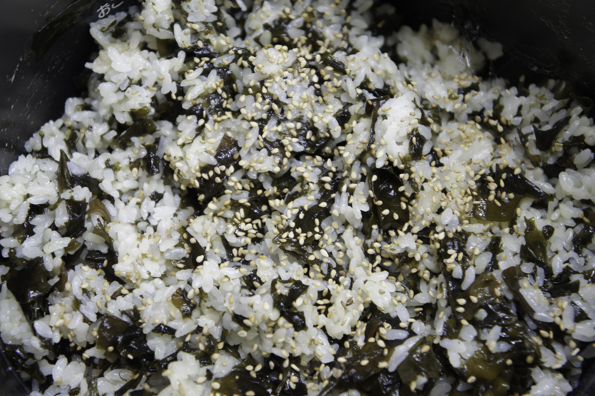 米にわかめと酒、うすくちしょうゆを入れて炊く。できあがったらまんべんなく混ぜて、ごまをふる。